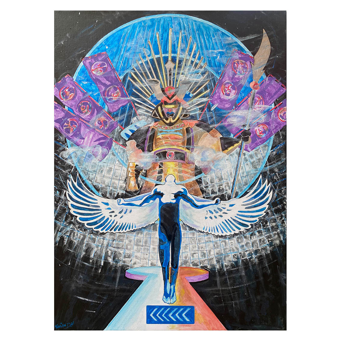 Les toiles « Hommages à » sont des peintures acryliques sur toiles, hommages aux Artistes du passé dont les créations sont un héritage. L’objectif est alors de revisiter par le signe les grands peintres et œuvres majeures de l’Histoire des Arts. Marina DH